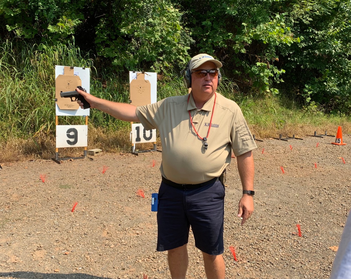 Karl starts the class shooting at 25 yards at what is essentially a plus sign, the idea being that the plus sign makes for more consistent alignment of the sights than does just shooting at a circular target area like a typical B8. He stressed the necessity of knowing that your gun/ammo combination is on or you will not have confidence in anything else you are doing. Karl spent some time assessing and explaining the proper cadence of trigger press for shooting accurately at this distance.